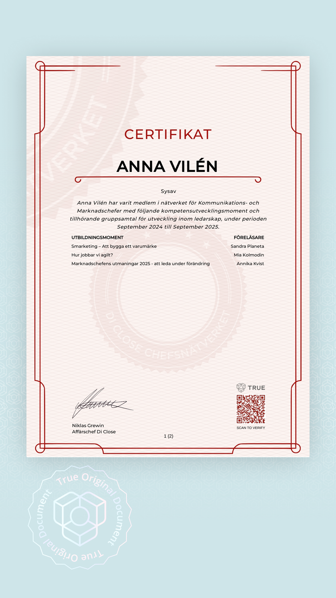 Alla TRUE -document är säkrade med blockchain-teknologi och kan verifieras som äkta. Klicka på verifieringsknappen bredvid dokumentet eller skanna QR-koden med din smartphones kamera. Ingen app krävs - dokumentets äkthet verifieras omedelbart.