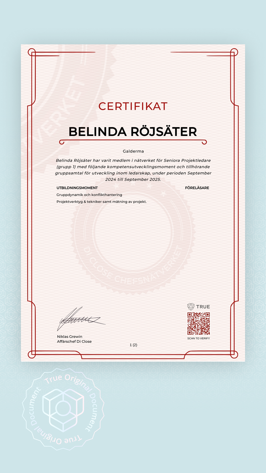 Alla TRUE -document är säkrade med blockchain-teknologi och kan verifieras som äkta. Klicka på verifieringsknappen bredvid dokumentet eller skanna QR-koden med din smartphones kamera. Ingen app krävs - dokumentets äkthet verifieras omedelbart.