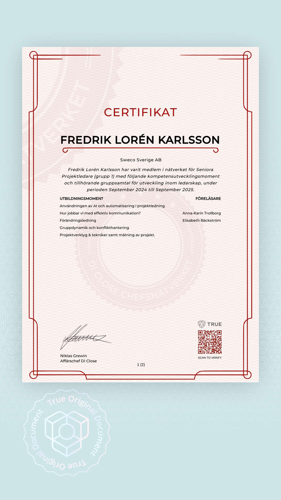 Alla TRUE -document är säkrade med blockchain-teknologi och kan verifieras som äkta. Klicka på verifieringsknappen bredvid dokumentet eller skanna QR-koden med din smartphones kamera. Ingen app krävs - dokumentets äkthet verifieras omedelbart.
