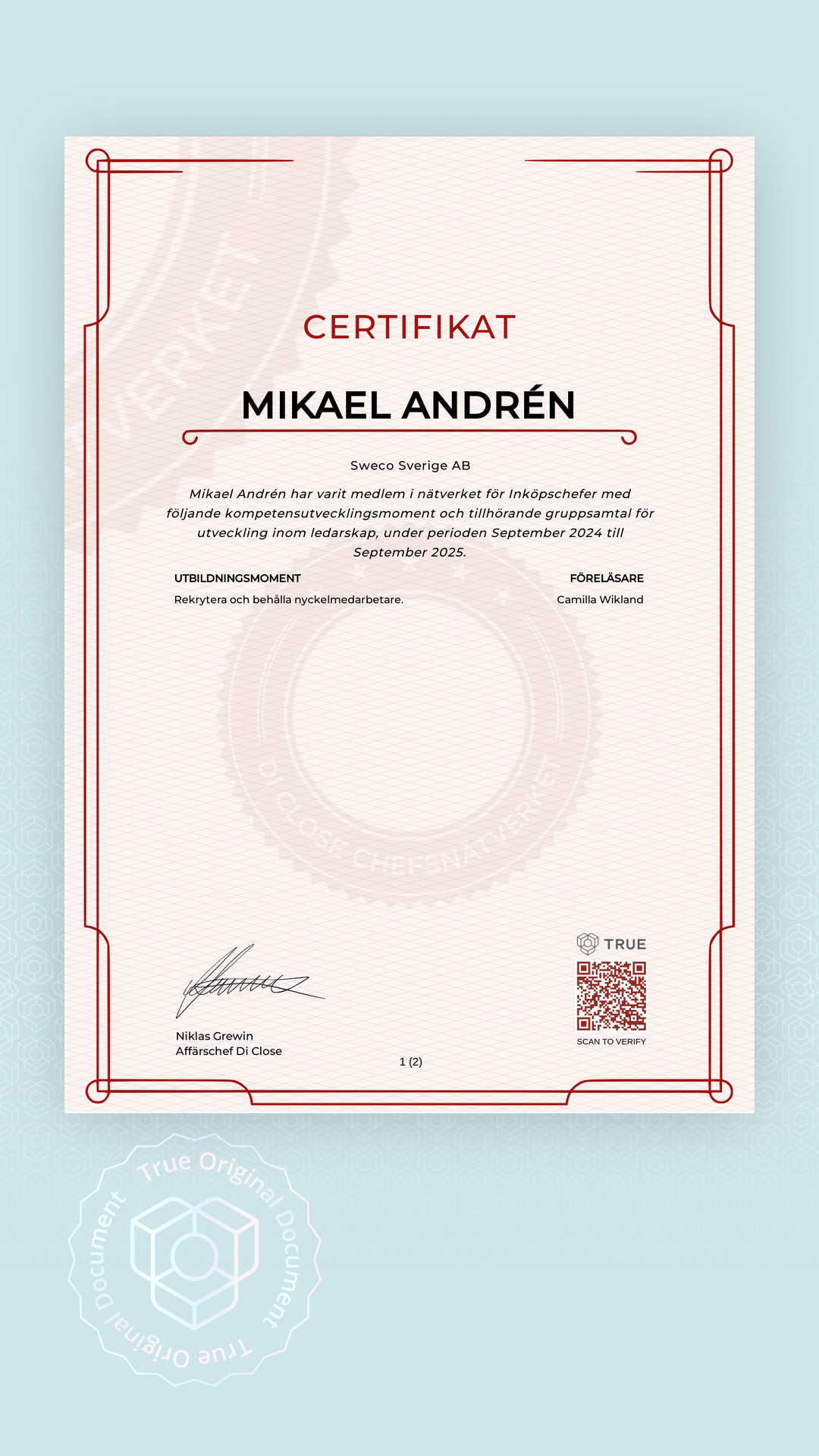 Alla TRUE -document är säkrade med blockchain-teknologi och kan verifieras som äkta. Klicka på verifieringsknappen bredvid dokumentet eller skanna QR-koden med din smartphones kamera. Ingen app krävs - dokumentets äkthet verifieras omedelbart.