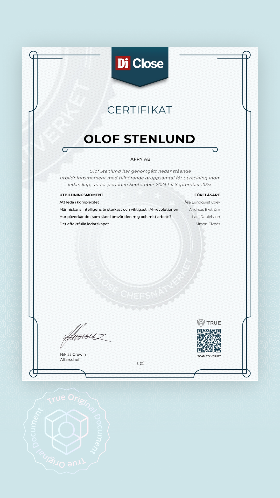 Alla TRUE -document är säkrade med blockchain-teknologi och kan verifieras som äkta. Klicka på verifieringsknappen bredvid dokumentet eller skanna QR-koden med din smartphones kamera. Ingen app krävs - dokumentets äkthet verifieras omedelbart.